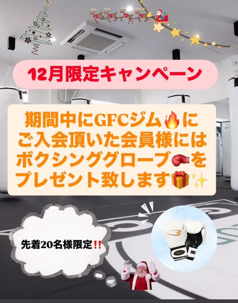 お知らせ 2025年12月03日(水) 12月限定のキャンペーンのお知らせ☆ 12月限定のキャンペーンで期間中にご入会頂いた会員様には 先着20名にボクシンググローブをプレゼントいたします🥊💫 この機会に一緒に格闘技を始めてみませんか?🔥 初心者の方🔰の方も大歓迎です‼️ ダイエット目的や、ストレス発散、本格的に格闘技を 始めたいという色んなかたがGFCジムには在籍しています♪ 年齢も幅広く最年少で5歳、最年長で50代後半の方まで 男女問わずみえます♪ 見学も体験も可能なのでお気軽にお問合せください♪